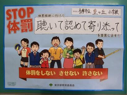 豊ヶ丘小学校の体罰防止スローガンは「聴いて 認めて 寄り添って」です。
