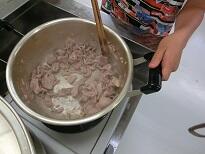 肉を炒めます。野菜も入れて炒め、水を入れて煮ます。