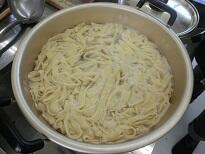 いよいよ麺をゆでます。太いので10分程度かかります。