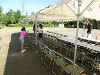 テントの下に机といすを並べます。いすには砂が入らないようにビニールテープを巻きます。
