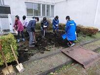 焼いた後の灰を入れる穴を事前に掘ります。子どもボランティアが大活躍。