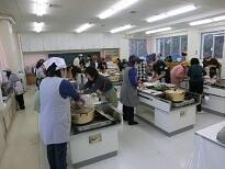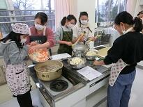 家庭科室では、朝からどんど焼きで振るまう料理を作っています。