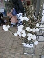 火が落ち着くと豚汁などか振るまわれ、篠竹に付けた繭玉を配りました。
