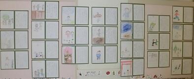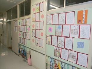 各学年の教室前廊下に展示しています。