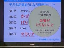 日本ユニセフ協会の講師の方が、世界の子どもたちがおかれている状況を1年生にも分かるように解説してくださいました。