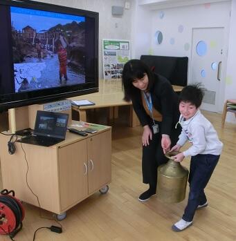 モニターに映した子どもように、水がめに水を入れて運ぶ体験をしました。