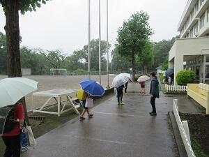 豊ヶ丘小学校の子たちは雨の中でも「3密」にならないように、待機線でしっかりと待つことが