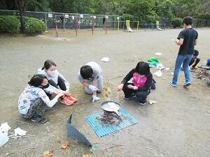 学校林で薪を集めて、昼食作りのための火起こしに悪戦苦闘中です。