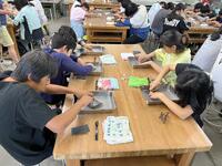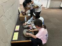 山梨県立考古博物館に到着しました。勾玉作りが始まりました。夢中になって、磨いて、磨いてきれいな勾玉を作っています。甲府市は、30℃前後の暑い日です。子供たちの体力も考慮して、一部プログラムを変更して、進めます。