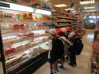 3年生の子供たちが、地域にあるスーパー「三徳 貝取店」を訪問しました。商品陳列棚を見たり、バックヤードを見たりしました。子供たちは、興味津々でぐるぐる周りを見渡して、様々な発見をしました。「冷凍食品は、マイナス18℃くらいの棚に置かれている。」「天井のミラーはぶつからないようにするためなの?」「店員さんはみんな笑顔でいいね」最後に店長さんが、リサイクルやお店の仕組み、従業員の方のことなどを丁寧に話してくださったので、メモカードいっぱいに書いている子がいました。