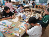 4年生が、「くぎくぎくんの楽しい暮らし」の学習で、様々な木を使った楽しい居場所を作っています。子供たちは、「この角度で、くぎくぎくんが見えるよ」「川があると楽しそう」「高いところを作ろう」とイメージを膨らませて作っていました。友達の作品を見ながら、たくさんのアイディアを木に込めて、加工して創り出していました。