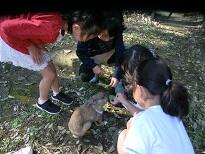 低学年の子どもたちが「かわいい」といって、なでたり餌をやったりしています。