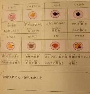 もうすぐ、お正月です。おせち料理のうち、かまぼこ、栗きんとん、昆布巻、黒豆、数の子、田づくり、海老、伊達巻のいわれを学習しました。