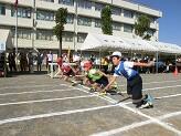 中学年「みんなでヒッパレ―!!」棒引きならぬ、短い縄を引きます。