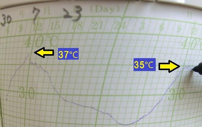 豊ヶ丘小の百葉箱の中にある自記温度計も、今年初めての猛暑日を記録しました。