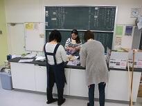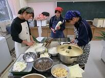 家庭科室では、朝からどんど焼きで振るまう料理を作っています。