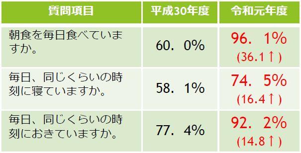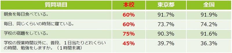 これは、生徒会や保健給食委員会、総合的な学習の時間で毎年実施している、基本的な生活習慣の見直しに向けた取組や、食育などによる啓発活動の効果と考えられる。