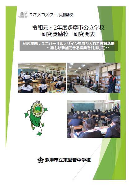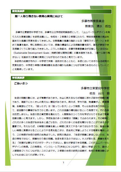 多摩市立東愛宕中学校では、多摩市公立学校研究奨励校として、「ユニバーサルデザインを取り入れた教育活動」を研究主題とし、令和元・2年度の2年間にわたり、特別支援教育の視点を踏まえた指導の充実を図ってきました。全教職員の指導の指針となる「愛宕スタンダート」を定めて指導を進め、特に各教科においては、授業の構造化による授業改善を図り、誰もが参加できる授業づくりに取り組んできました。こうした取組は、多摩市教育委員会が目指しているSDGs(Sustainable Development Goals:持続可能な開発目標)の基本理念である、「誰一人取り残さない」を踏まえた教育の実現につながるものであると考えています。