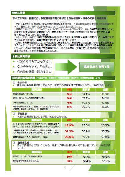 こうした背景を踏まえ、これからの未来に希望をもち、持続可能な社会の創り手となる生徒を育成するために、これまでの本校の実践で成果が認められた特別支援教育の視点による生徒理解・指導について、改めて全教職員で共通理解を図り、すべての学級・授業において共通実践を図ることが重要だと考え、本研究を進めることとした。