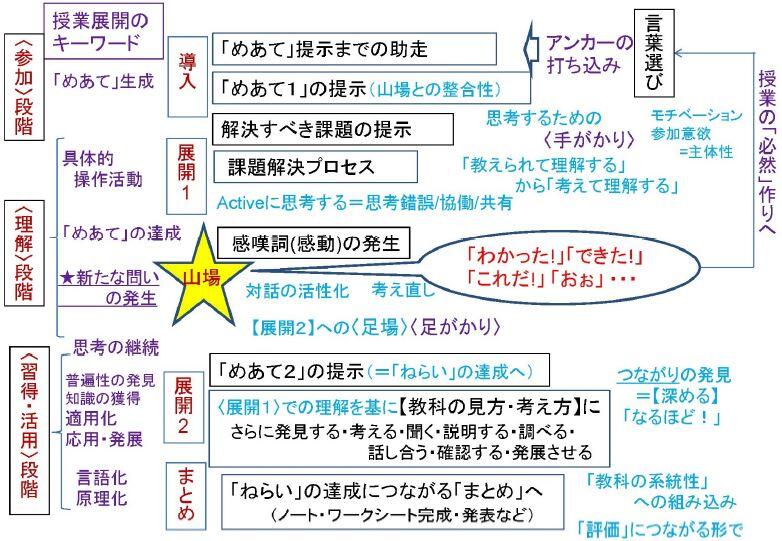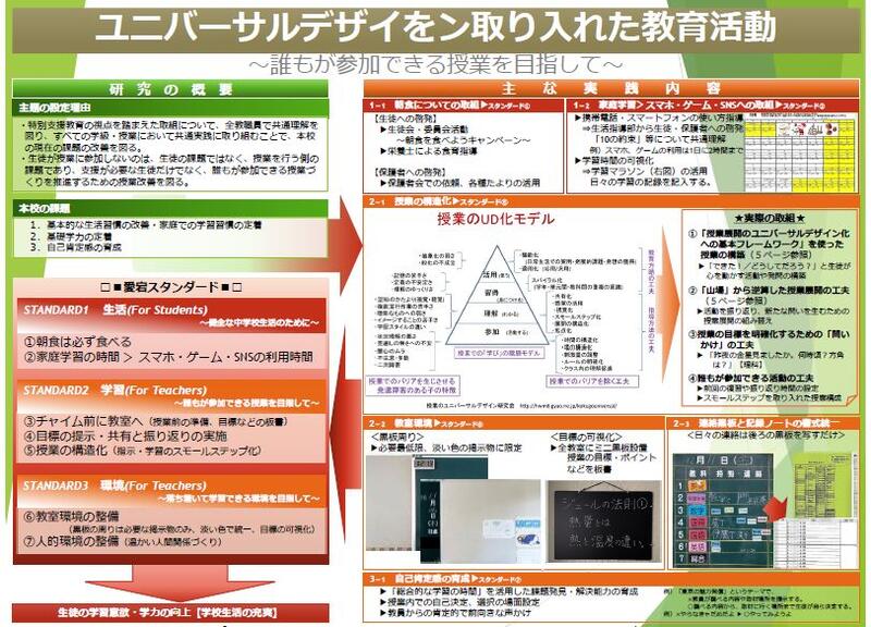 また、家庭学習の定着のために、学習内容の可視化に取り組んできた。授業改善においては、授業のユニバーサルデザイン化モデルを活用し、生徒が新しいことに気が付く瞬間(授業の山場)から逆算した授業展開の構築、効果的な学習の目標の発信と共有方法について研究を重ねてきた。