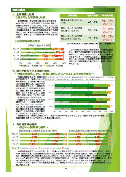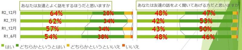 本校独自の生徒アンケートにおける、「友達とよく話をする方だと思いますか」という質問に対して、平成31年度(令和元年度)の研究開始当初は54%だった回答が、同年度12月の調査では57%、令和2年度の7月の調査で62%、最終調査で64%と回を重ねるごとに上昇していった。
