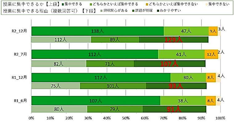 令和2年度の生徒アンケートでは、「授業がゆっくりでポイントも明確だから」、「(授業で使用する)プリントがわかりやすいから」といった記述回答もあり、授業の構造化を踏まえた授業改善の取組が、生徒の授業への参加意欲につながっていると考えている。