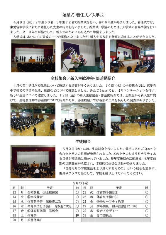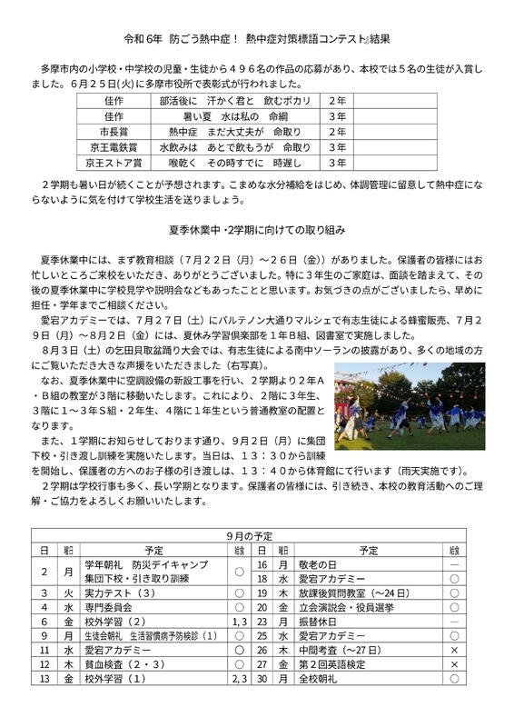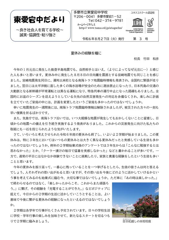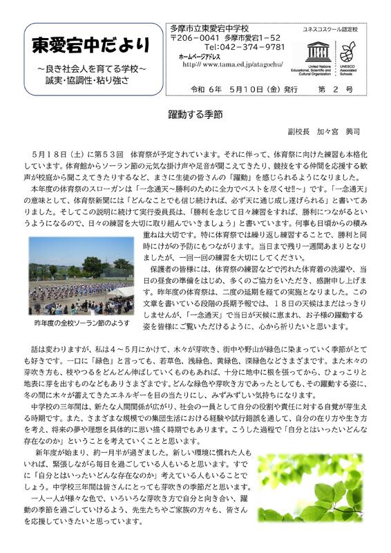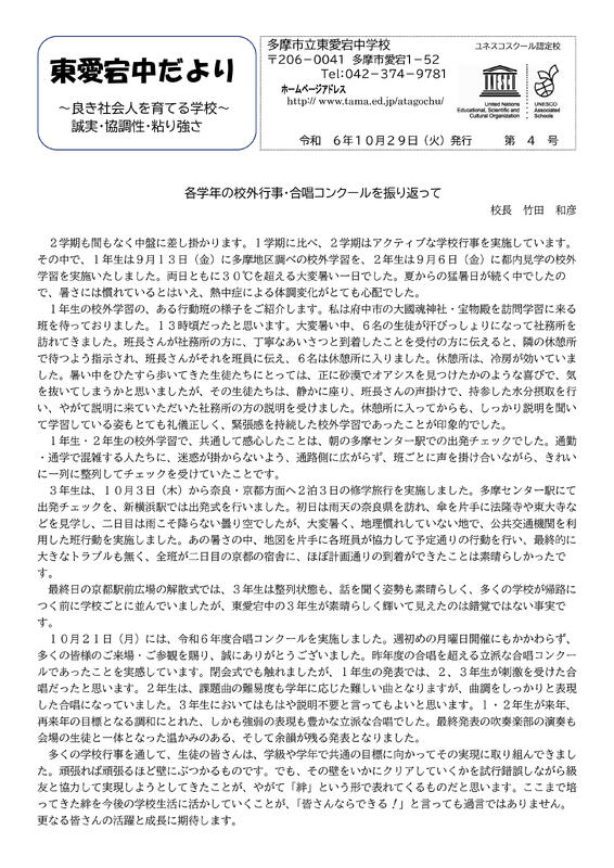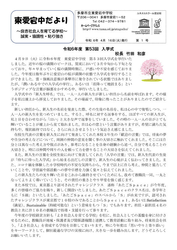 ホーム学校概要 沿革・教育活動あたごSpace学校行事東愛宕中だより 令和7年度令和6年度日誌 令和7年度令和6年度お問い合わせ・アクセス
