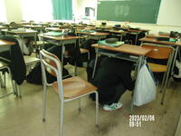 | 訓練時の行動例 屋外の場合:周囲の危険物に注意しながら姿勢を低くし、揺れがおさまるまで雑誌やカバンなどで頭を守る。 |