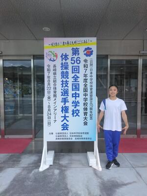 3年泉希美さんが8月上旬に東京駒沢体育館で行われた関東大会で個人5位に入り、8月22日から長崎県立総合体育館で行われた第56回全国中学校体操競技選手権大会に出場しました。全国から200名以上の選手が集まり大会が行われました。開会式では、 オリンピック4大会に出場し、個人総合2連覇を含む7つのメダルを獲得した長崎県出身の内村航平さんの演技と参加者へメッセージが送られました。
