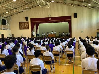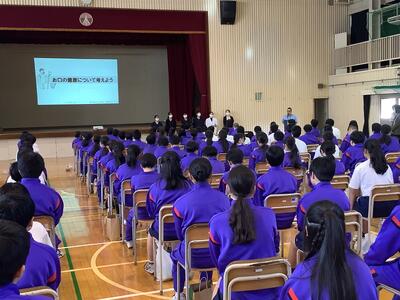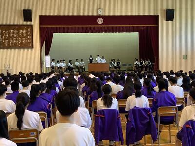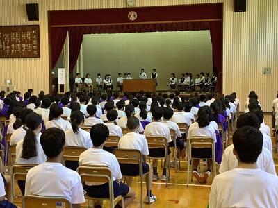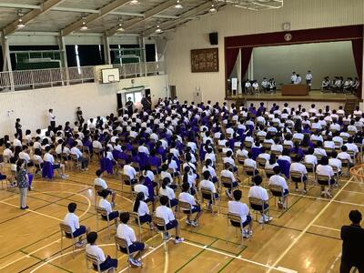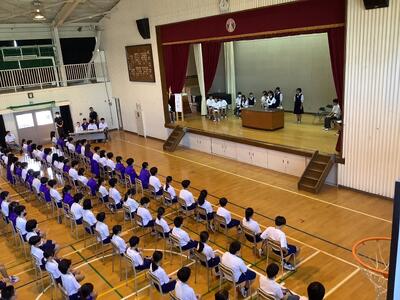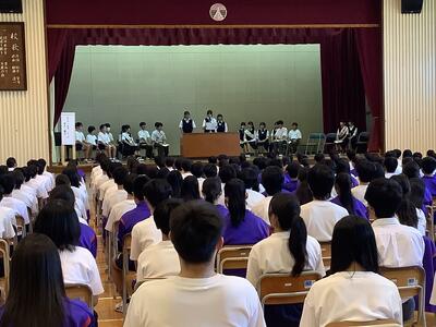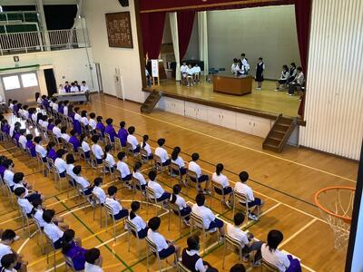 感染症防止対策で生徒会役員選挙が延期されていましたが、この日の午後、体育館で立会演説会を行いました。1,2年生で立候補した生徒は、より良い落合中にするためにできることを力強く訴えていました。また、応援演説をした生徒は、立候補者のやる気や適性を具体的に伝えていました。