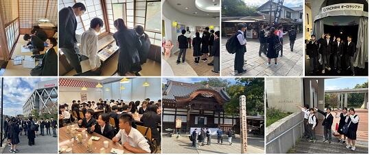 今日は1年生の校外学習です。この日のために、自分たちで見学コースや昼食場所など計画を立ててきました。朝、多摩センター駅に集合した1年生たちは、班ごとに目的地に出発しました。写真は、見学地での生徒たちの様子です。