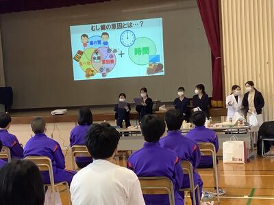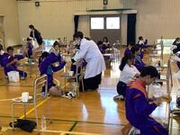 「お口の健康について考えよう」をテーマに、1年生(5組全員を含む)を対象に、ブラッシング教室を行いました。特別講師は、学校歯科医の佐々木先生と歯科衛生士の方々にお願いし、歯垢染色液を使って、鏡を見ながら歯がきれいに磨けているかチェックしました。普段の磨き方だと、なかなか歯がきれいになっていないことや、歯を磨くタイミングを再確認することができました。また、美味しい食事をするためにも、欠かせない存在である歯をいつまでも大切にしようと感じた授業となりました。講師の先生方、ありがとうございました。