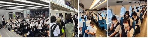 3年生たちは新横浜駅で出発式を終えた後、新幹線に乗り込み新大阪駅に向かっています。駅を出て、バスに乗り奈良方面に向かいます。