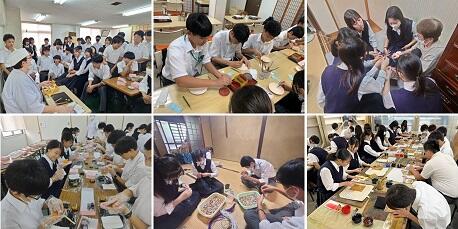 今日の班行動では、各班が選んだ体験先で体験学習を行います。和菓子、念珠、組紐、絵付けなどの体験を各班行います。写真は体験中の生徒たちの様子です。