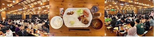 写真は、朝の宿舎玄関の様子、朝食のメニュー、食堂スタッフへの挨拶、掃除の様子です。