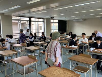 ユニクロの「服のチカラ”プロジェクト」に参加するために、出前授業を1年全員が受けました。この活動は、生徒たちが主体となって、校内や地域で着なくなった子ども服を回収し、集めた服を種類ごとに分け、指定の倉庫へ発送すると、世界の紛争等で難民となってしまった子どもたちに必要な服を届けることができます。また、この活動は、2021年の文部科学省主催「青少年の体験活動推進企業表彰審査員会優秀賞」を受賞し、昨年度は744校・約82,000人の児童・生徒が参加しています。