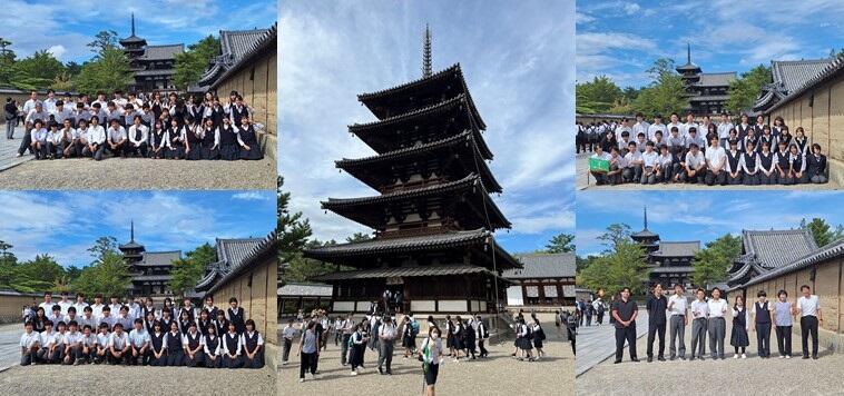 奈良の最初の目的地、法隆寺に行きました。クラスごとに集合写真を撮ったり、金堂、五重塔などを見学しました。青空も見られ天候にも恵まれた中、見学できているようです。