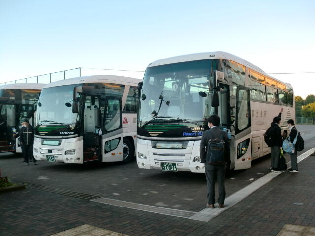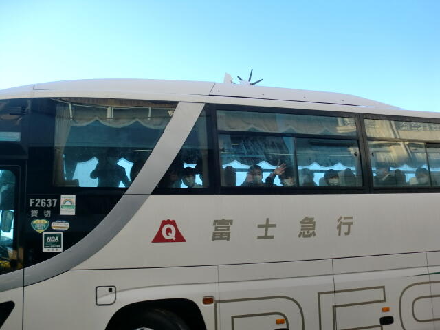 生徒はさわやかな朝日を浴びながら、笑顔でバスに乗車しました。