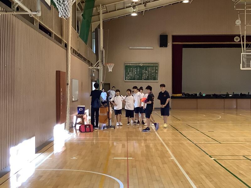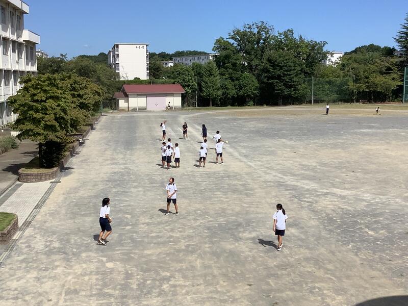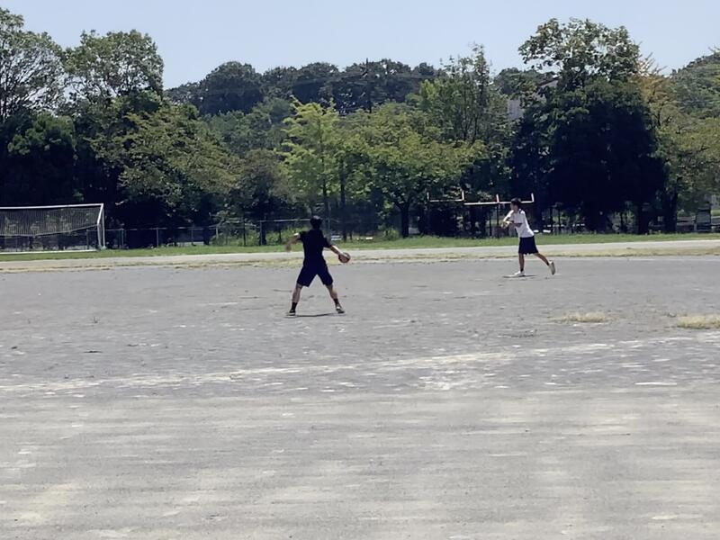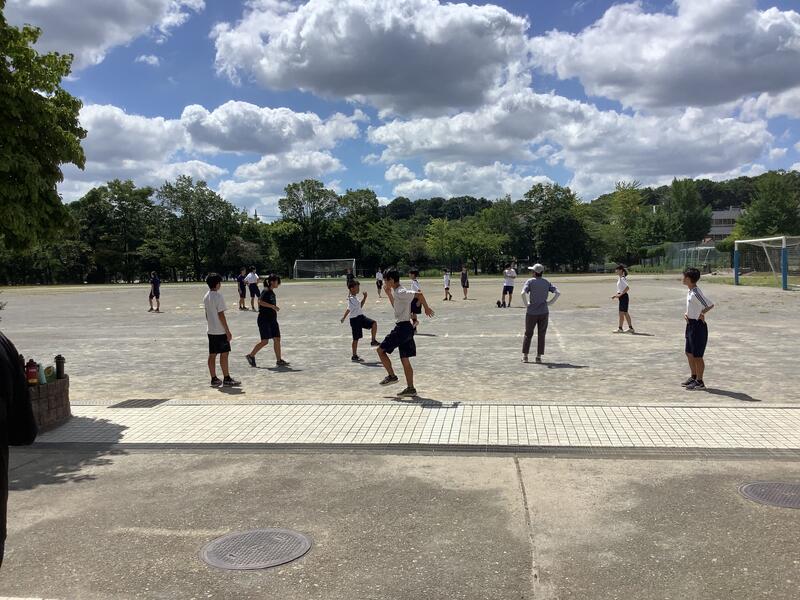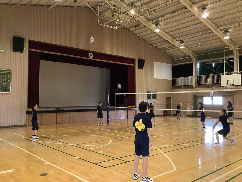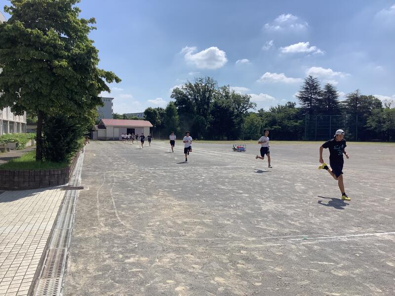 今日も朝から気温が上がり、11時過ぎには基準値を超えてしまったため、校庭での活動は中止になり、陸上部は屋内での練習に切り替えて実施していました。校庭の練習風景は、円盤投げの練習の様子です。バドミントン部では、部活動指導員のコーチが来てくださって練習をしていました。