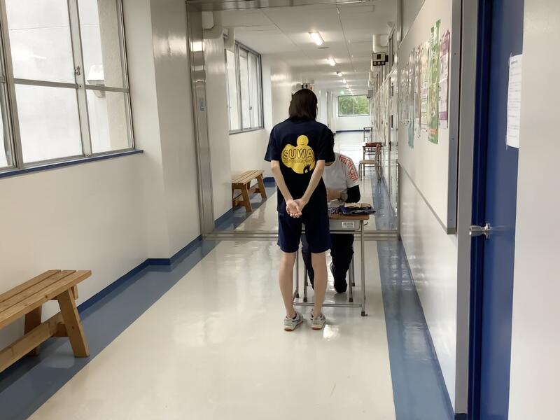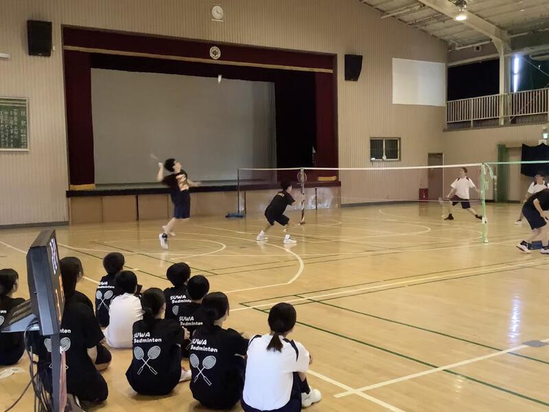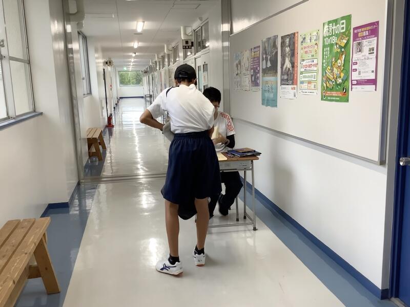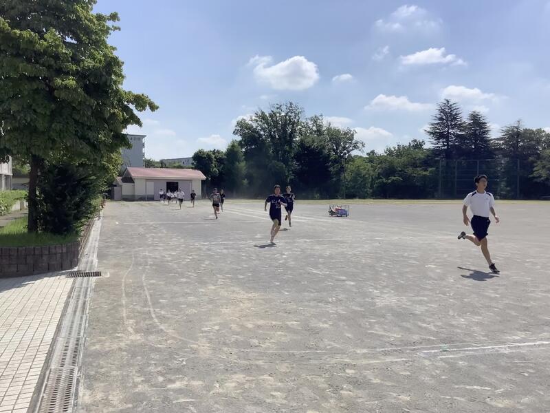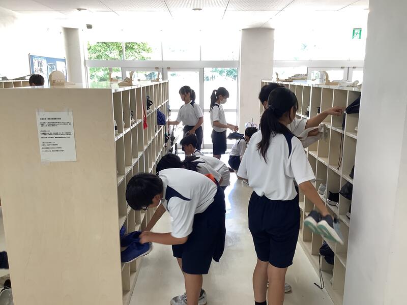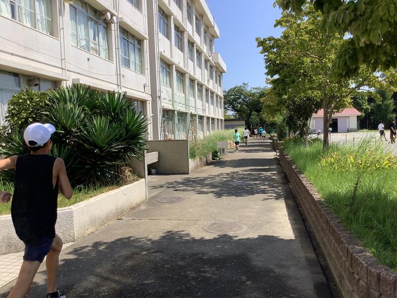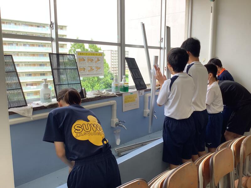 今日も朝から気温が上がり、11時過ぎには基準値を超えてしまったため、校庭での活動は中止になり、陸上部は屋内での練習に切り替えて実施していました。校庭の練習風景は、円盤投げの練習の様子です。バドミントン部では、部活動指導員のコーチが来てくださって練習をしていました。