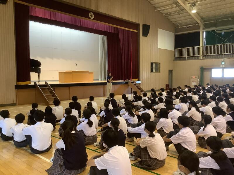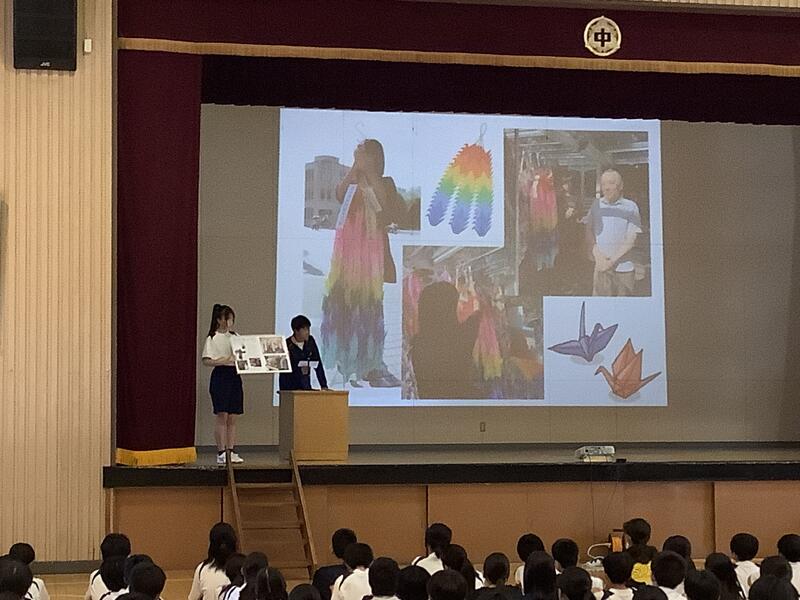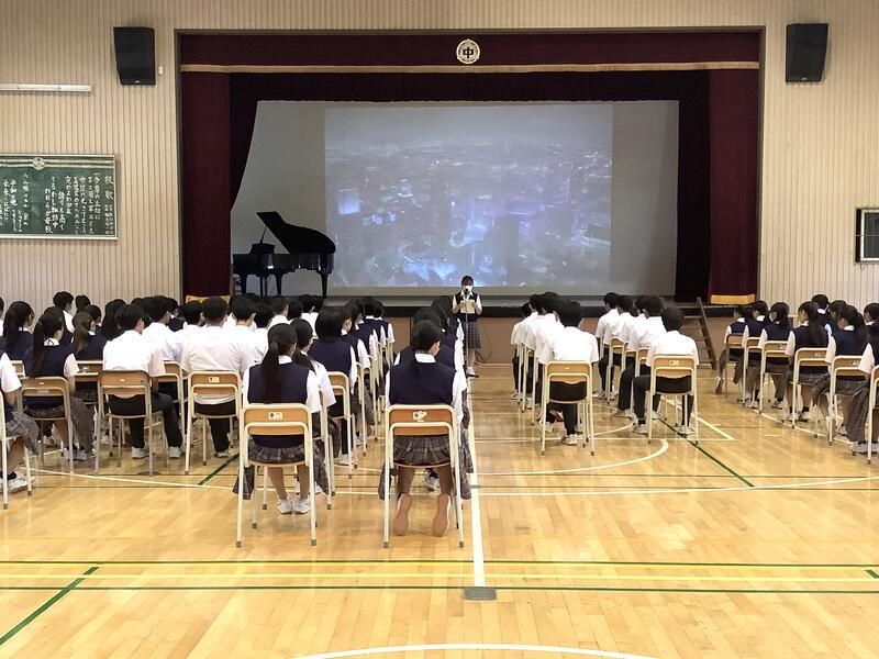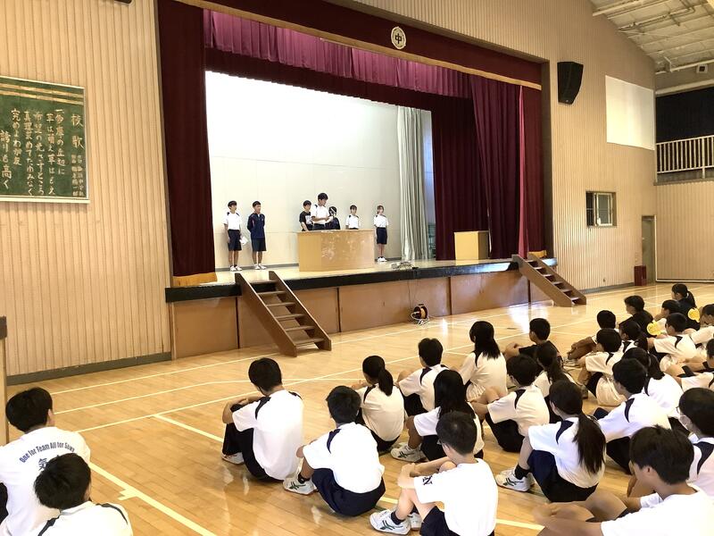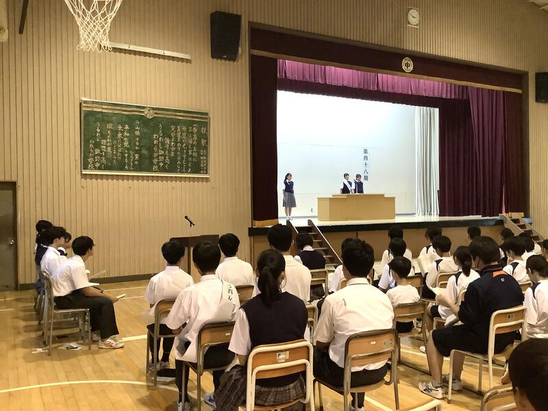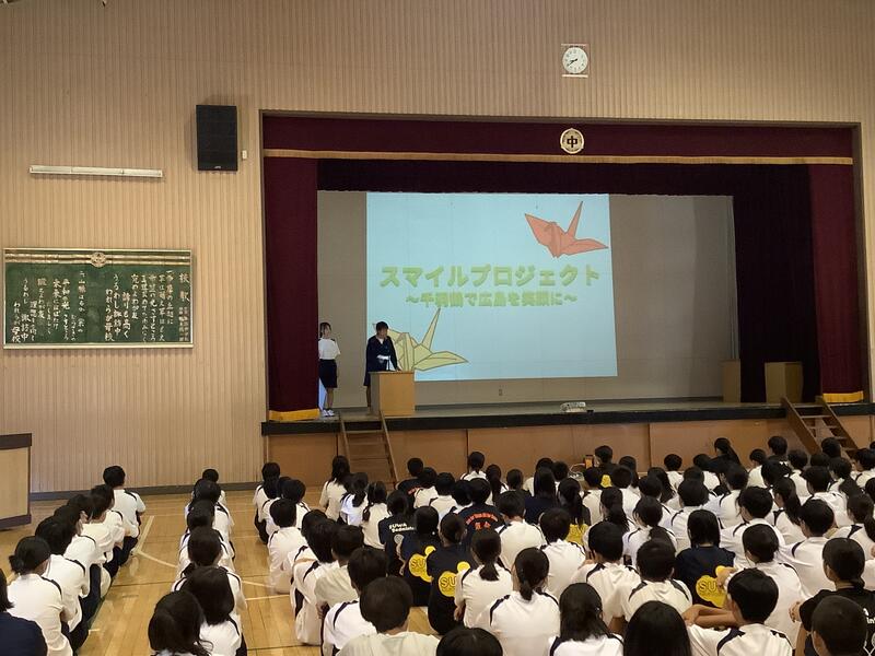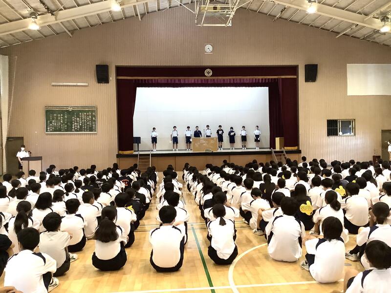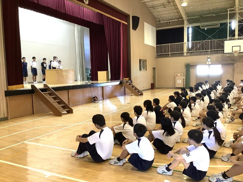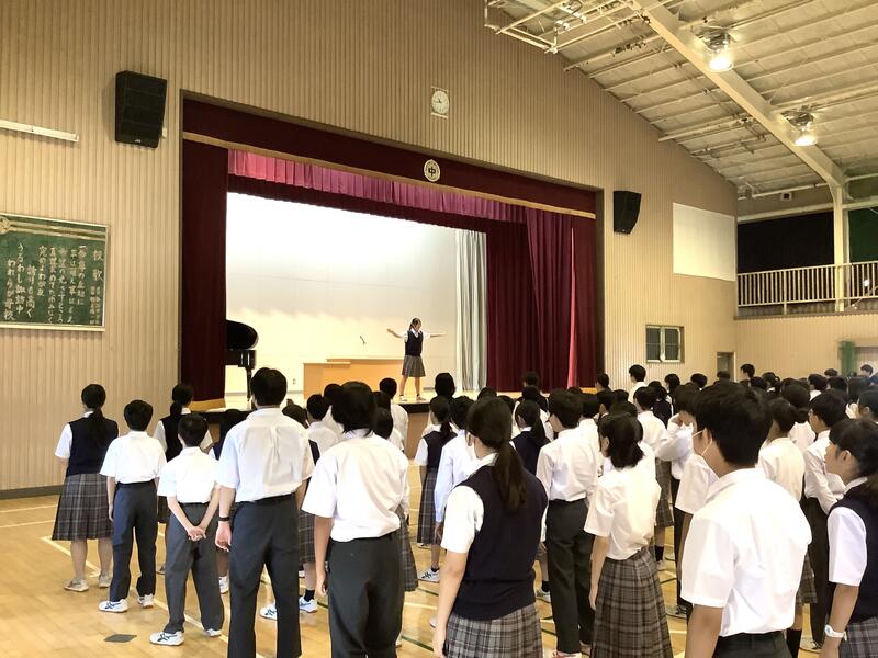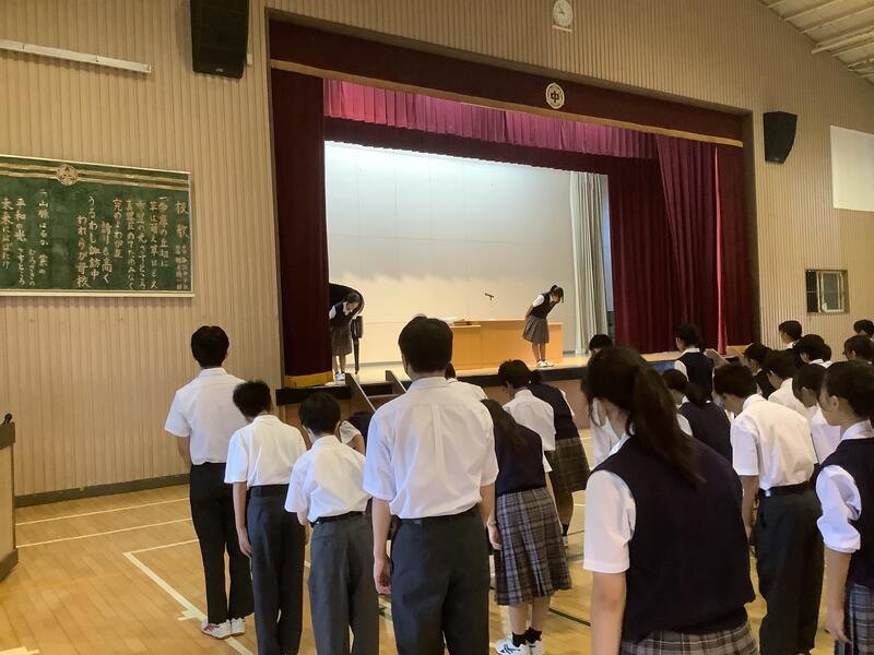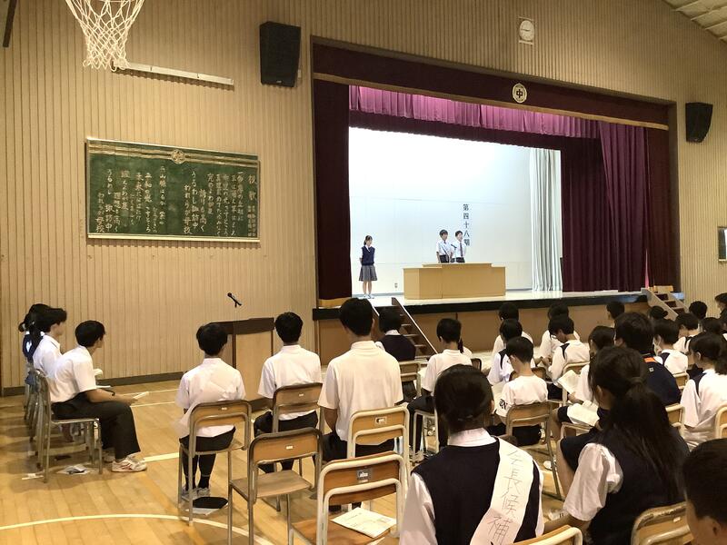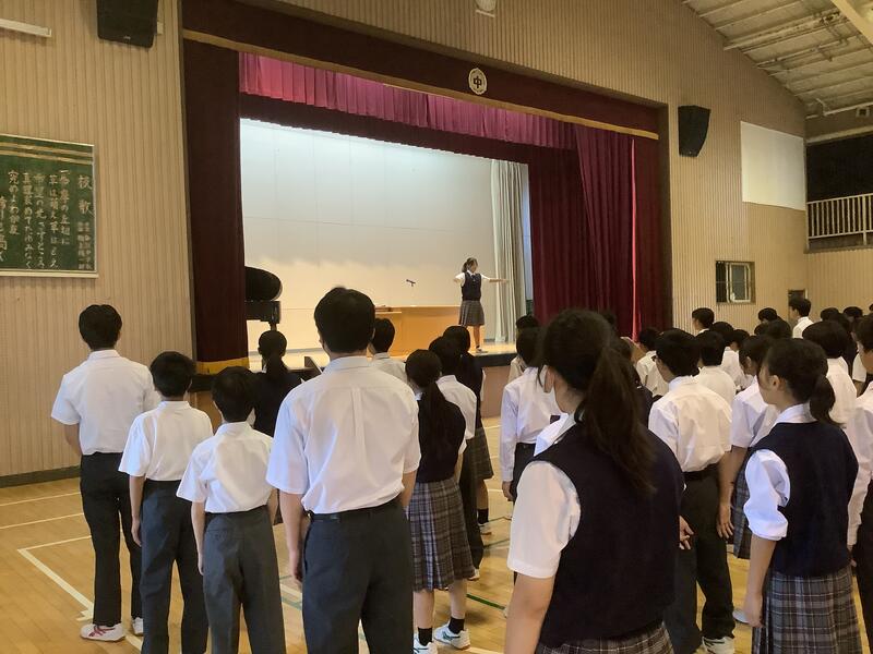 7年度前期最後の生徒会朝礼でした。各委員長からは、今期の活動を振り返り、目標や活動内容に対する達成度の報告と、生徒に向けた依頼や連絡がありました。また、生徒会からは、全校生徒で千羽鶴の制作を行った「スマイルプロジェクト」の総括がありました。朝礼後には、陸上競技部の表彰と、担当の先生から9月10月の生活重点目標についての話がありました。