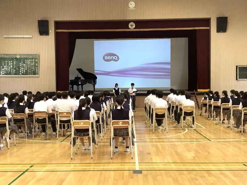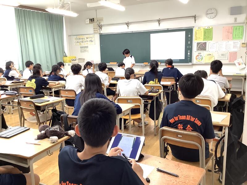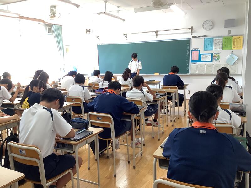 1学期の最後の時間には、3年生が学年集会を開きました。どの学級委員も非常に落ち着いた態度で話し、また、下級生に比べると聞いている人への訴える力がとても強くありました。聞いている生徒の姿勢も、やはり一番しっかりとしていました。学級委員長からは映像を活用して、訴えたいことがよりわかりやすく伝わっていました。