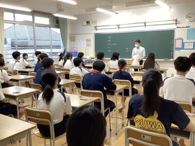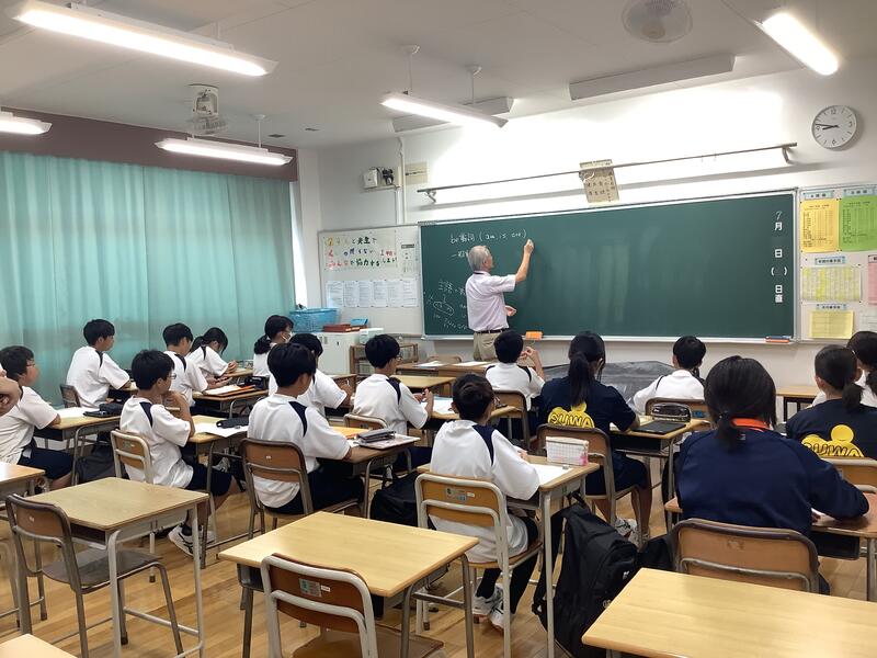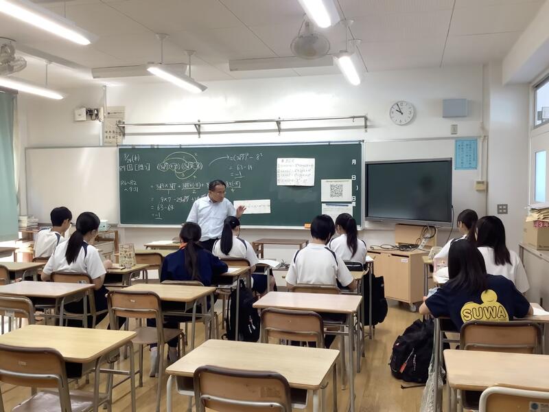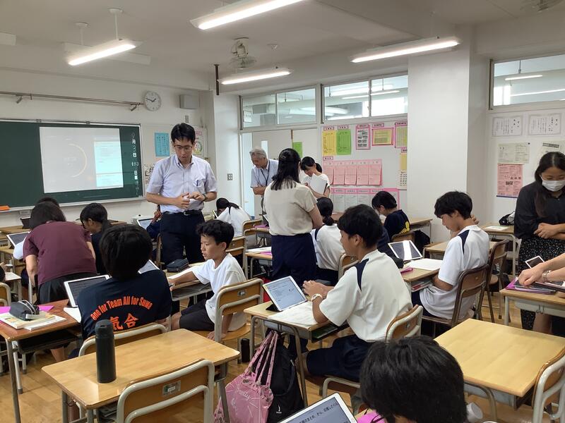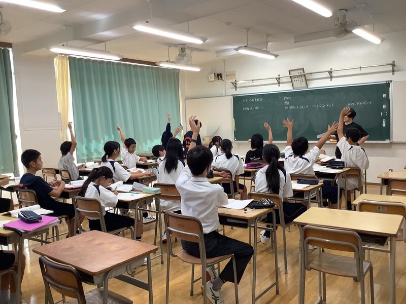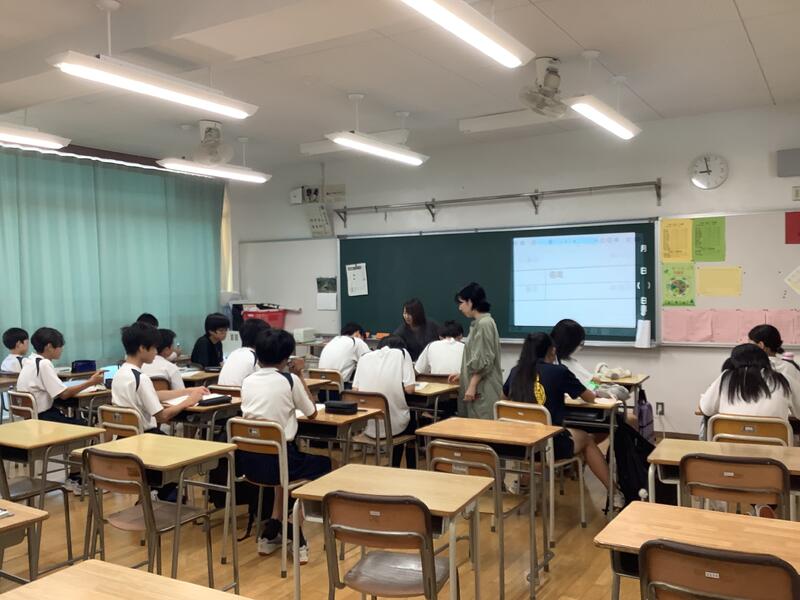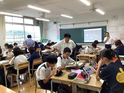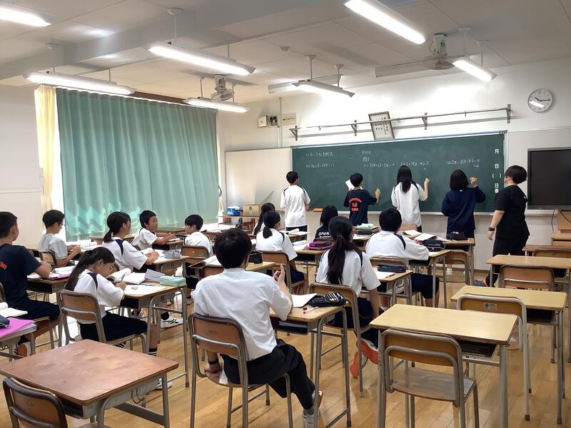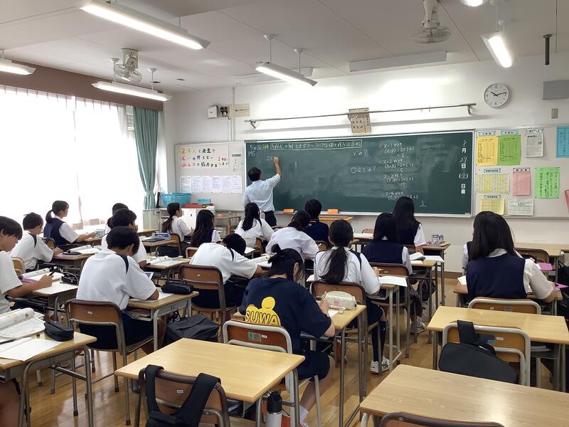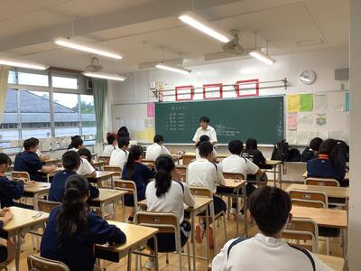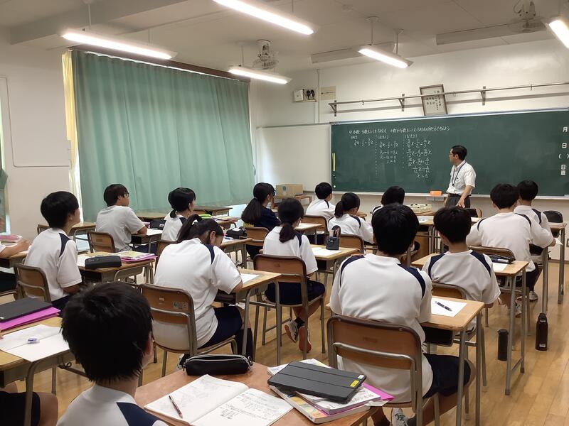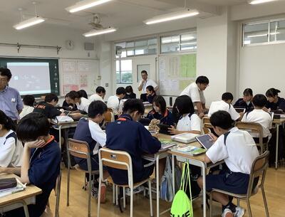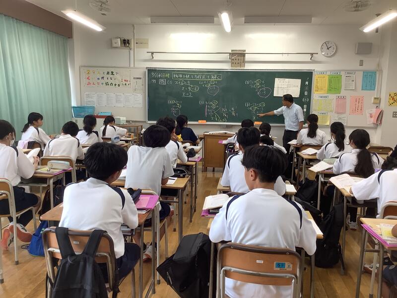 5時間目は、教員の研修のための研究授業が行われました。1年2組4組の数学の少人数授業において、全教員が授業を見て、その後意見交換を行いました。