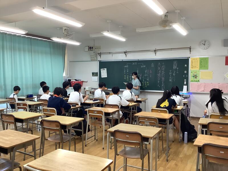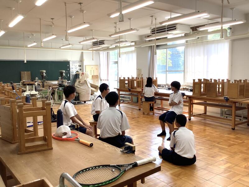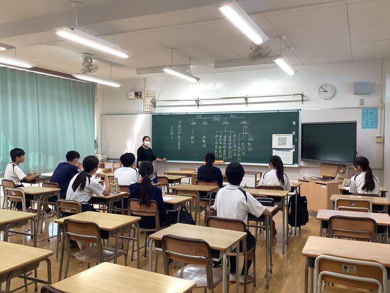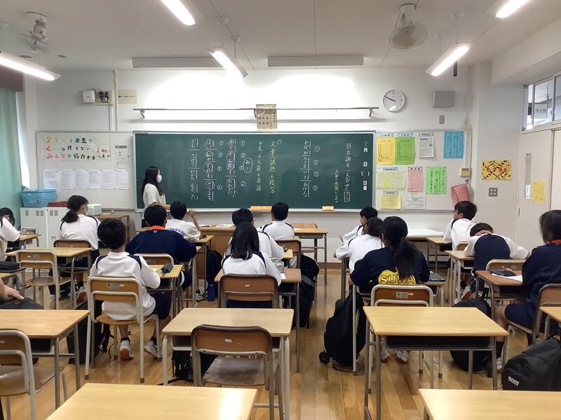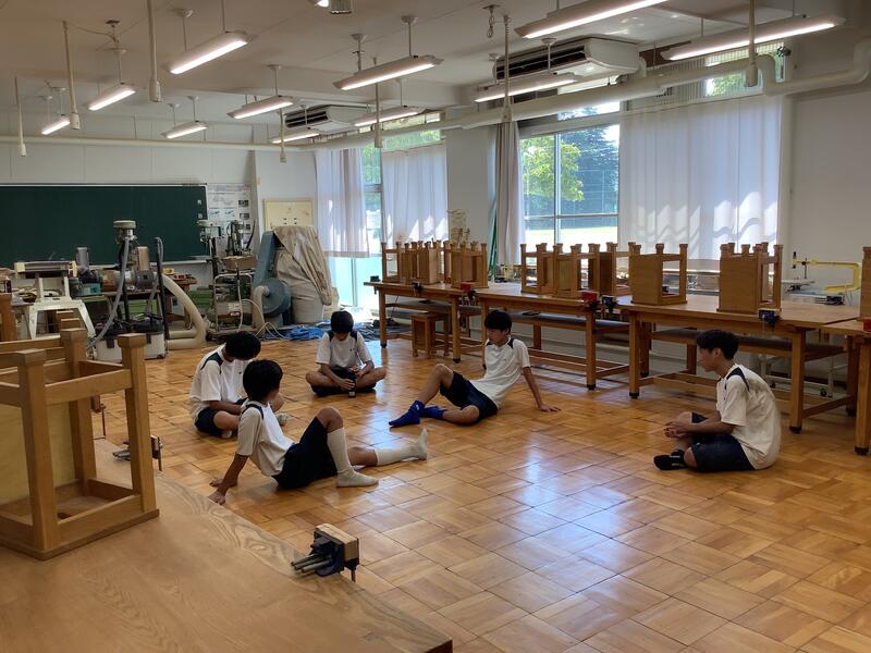 1年生の授業の様子です。国語では、竹取物語の暗唱のテストを行っていました。慣れない文体のものを一生懸命覚えて、一人ずつ先生の前で発表していました。技術では木工に関わる工具について、映像や実物を見ながら学習していました。
