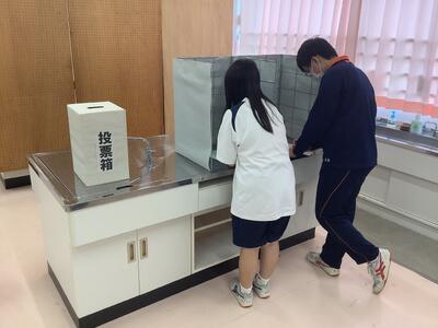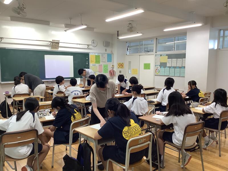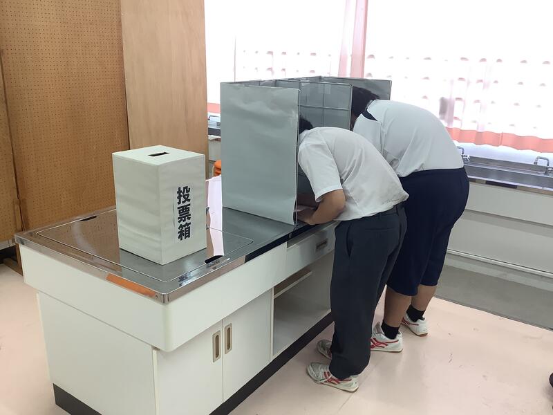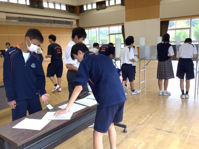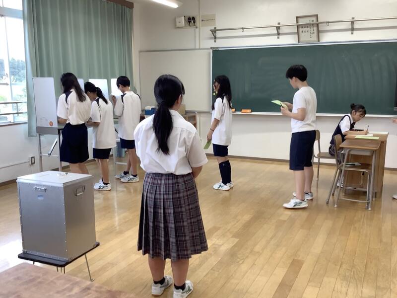 5組では12日の生徒会役員選挙を前に、社会科の時間に選挙に関する学習を行いました。映像資料やプリントを活用しながら、投票所入場券、投票用紙、記載台など、実際に使われているものに寄せたものを使って、模擬投票までを行っていました。