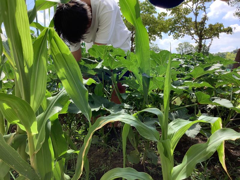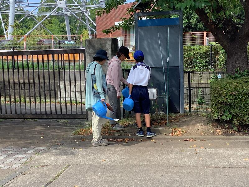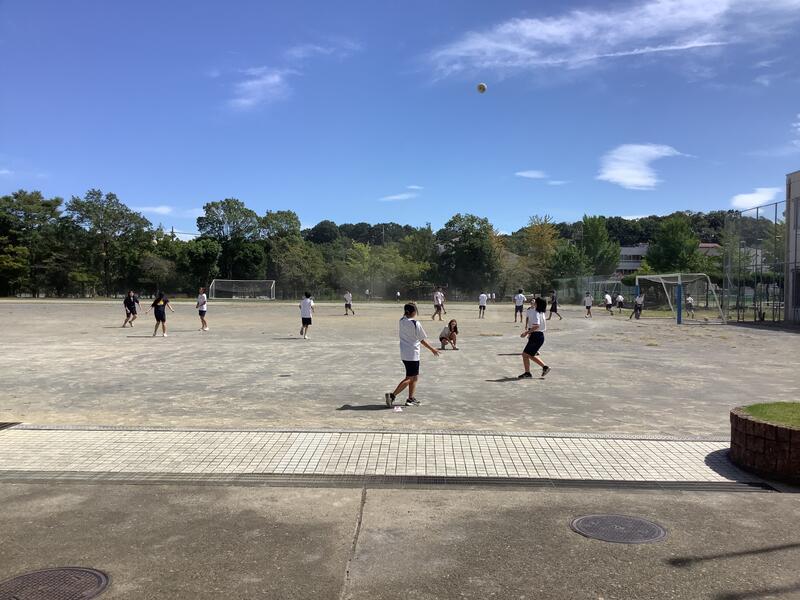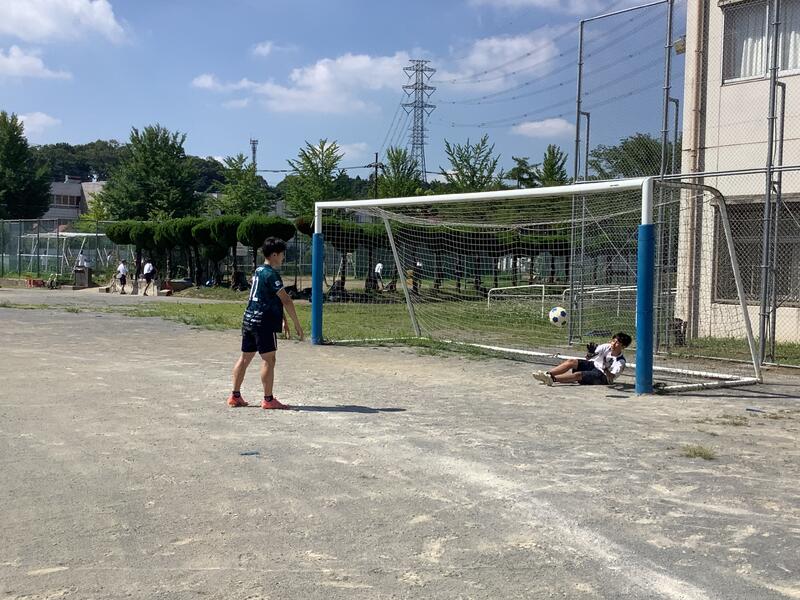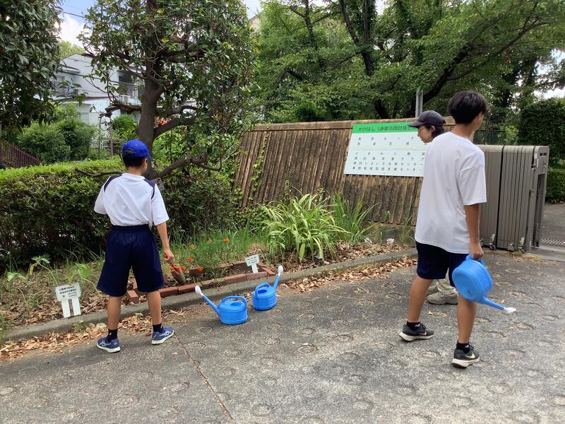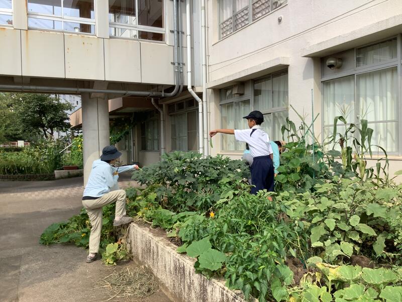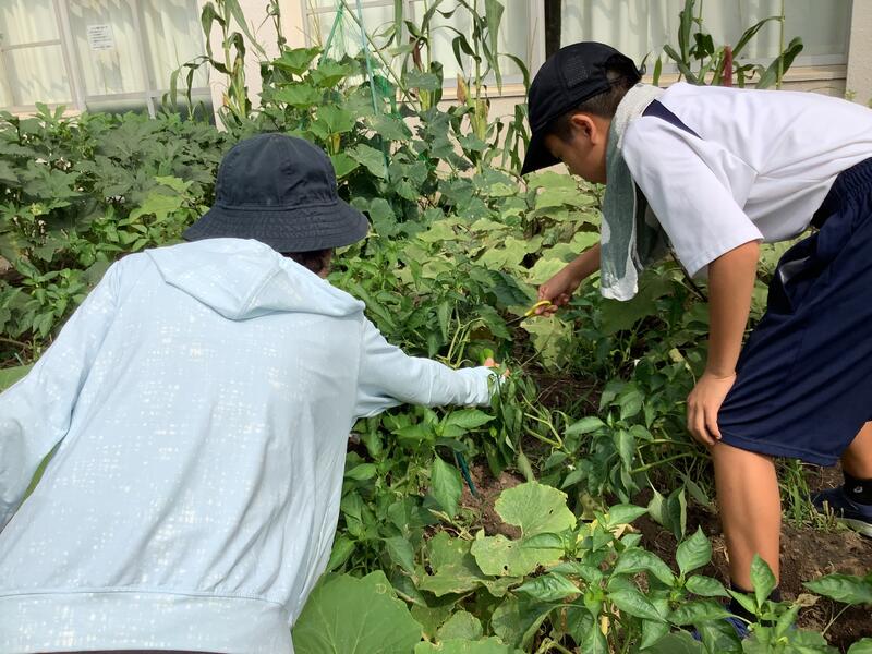 校庭では、サッカー部が合同チームを組んでいる稲城三中との合同練習を行っていました。また、家庭栽培部は、水やりとキュウリ•ナス•ピーマン•ゴーヤなどの作物の収穫作業を行っていました。収穫した作物をいただきましたが、とても新鮮でみずみずしくておいしかったです。