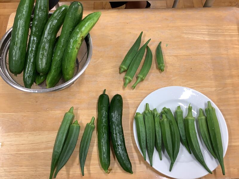 家庭栽培部は水やりをし、作物の収穫を行っていました。丁寧に育てた作物が順調に育って大きな実をつけています。今日はオクラとキュウリの収穫でした。