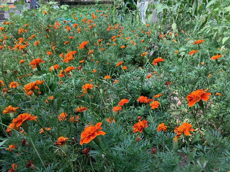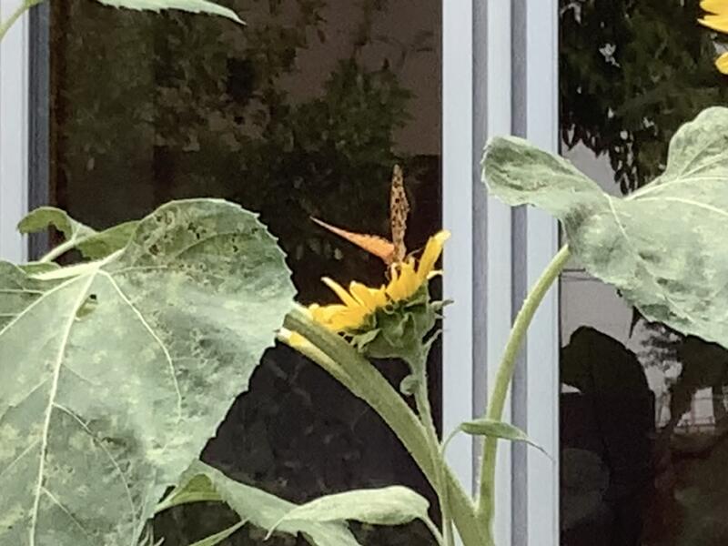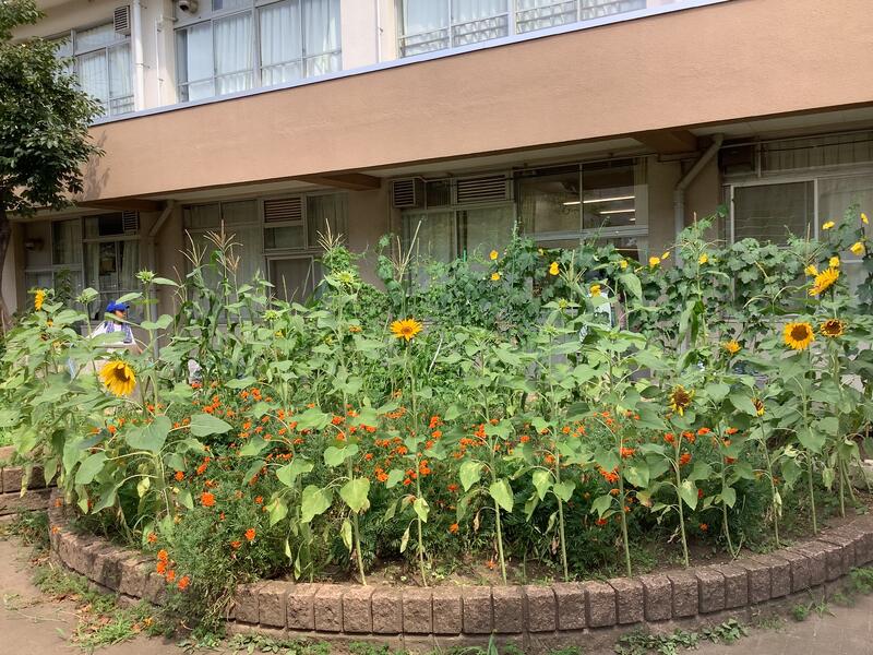 家庭栽培部nが、水やりや草取りなどの手入れを一生懸命に行っているおかげで、野菜だけでなく、向日葵などの花とてもきれいに咲いています。よく見ていると、蝶やハチなどの虫が嬉しそうに飛び回っています。
