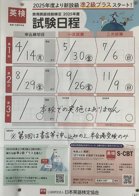 9月26日に開催される英語検定の申し込みが29日となっています。申し込みは、この1日のみとなりますので、受検希望の人は封筒と受検料の準備を忘れないようにしてください。