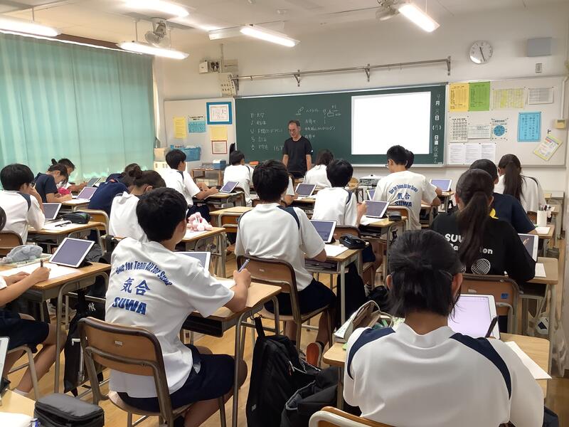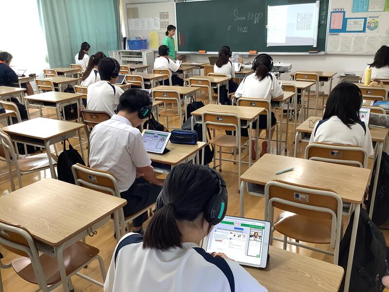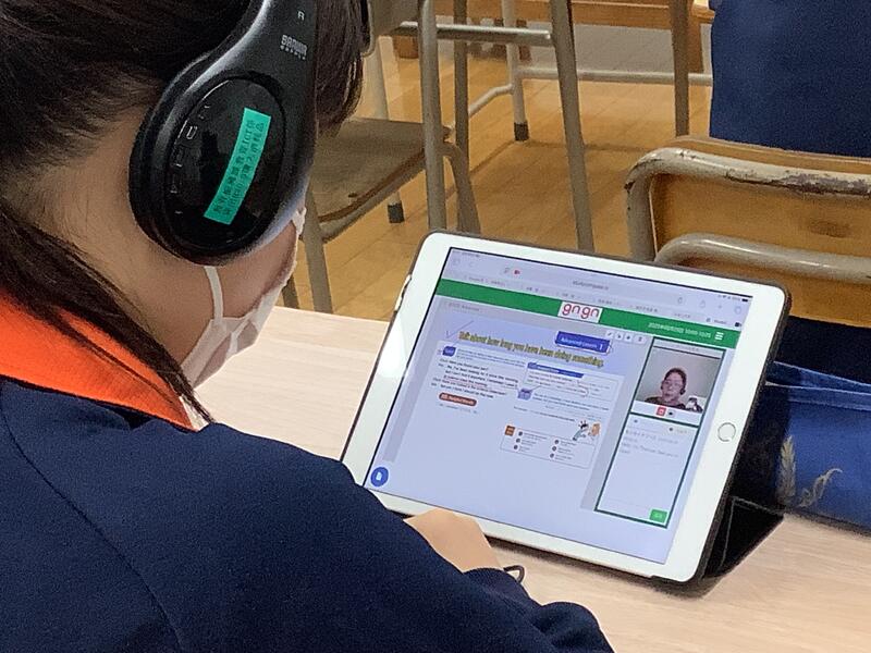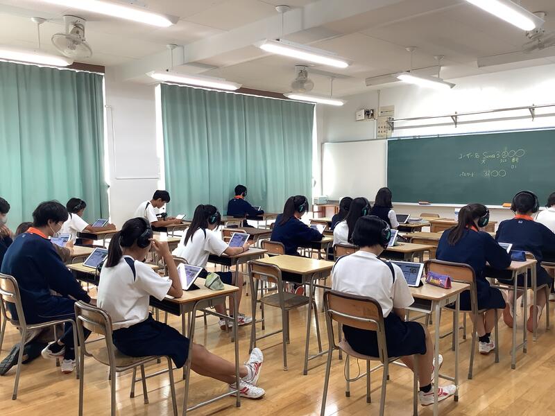 3年生の英語の授業では、オンライン英会話が行われました。これは多摩市独自の事業で、外国のネイティブの方々と、タブレット端末とヘッドセットを活用して英語による会話の学習を進めるというものです。都立の受検では、ESAT-Jもありますので、それに向けてもとてもいい機会になっていると思います。